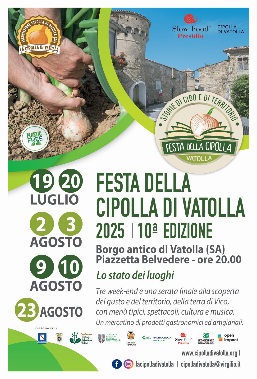 La Festa della Cipolla di Vatolla è una manifestazione molto originale ed innovativa nella sua formula: musica e danze popolari, convegni e incontri, mostre d’arte e spettacoli teatrali, poesia, teatro, numerosi laboratori didattici dedicati alla cultura orale e materiale, al paesaggio, alla Dieta Mediterranea e alla riscoperta della filosofia vichiana, della storia e la vita di questo grande intellettuale vissuto a Vatolla dal 1686 al 1695, che riportano il filosofo nelle strade e nei sentieri del borgo.